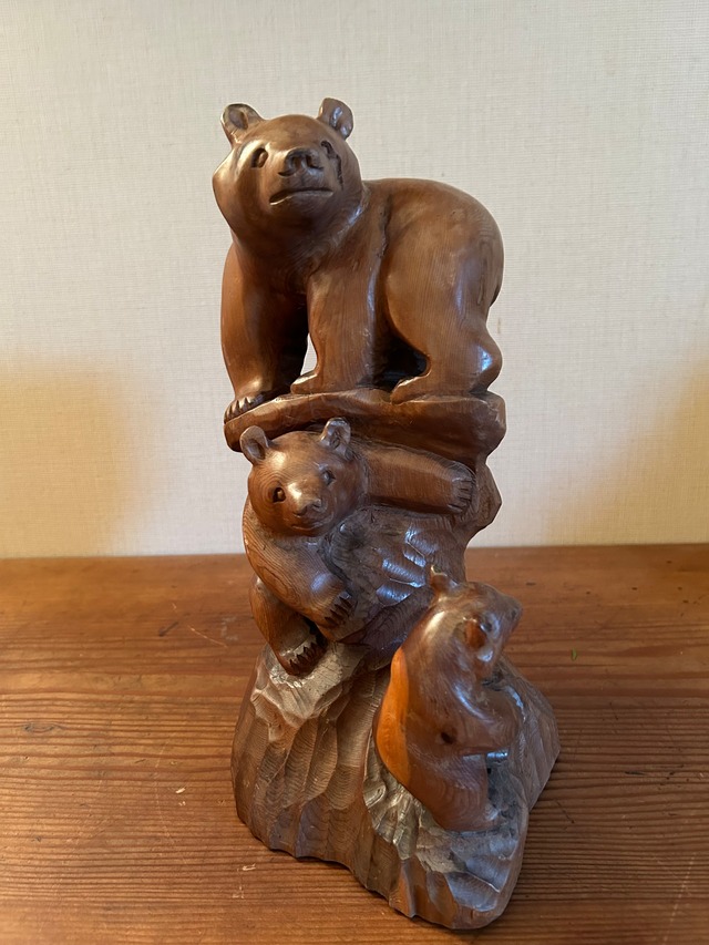 親子熊の木彫りの置物です。 お母さん熊と子熊2匹が木登り?しています。 年月が経っており艶があります。 目立った破損等はありませんが 最初からなのか、年月を経てできたものなのか ヒビや傷.シミなどがあります。 写真を参考にしてください。 サイズ 高さ約34.5cm 幅約17cm 奥行き約22.5cm