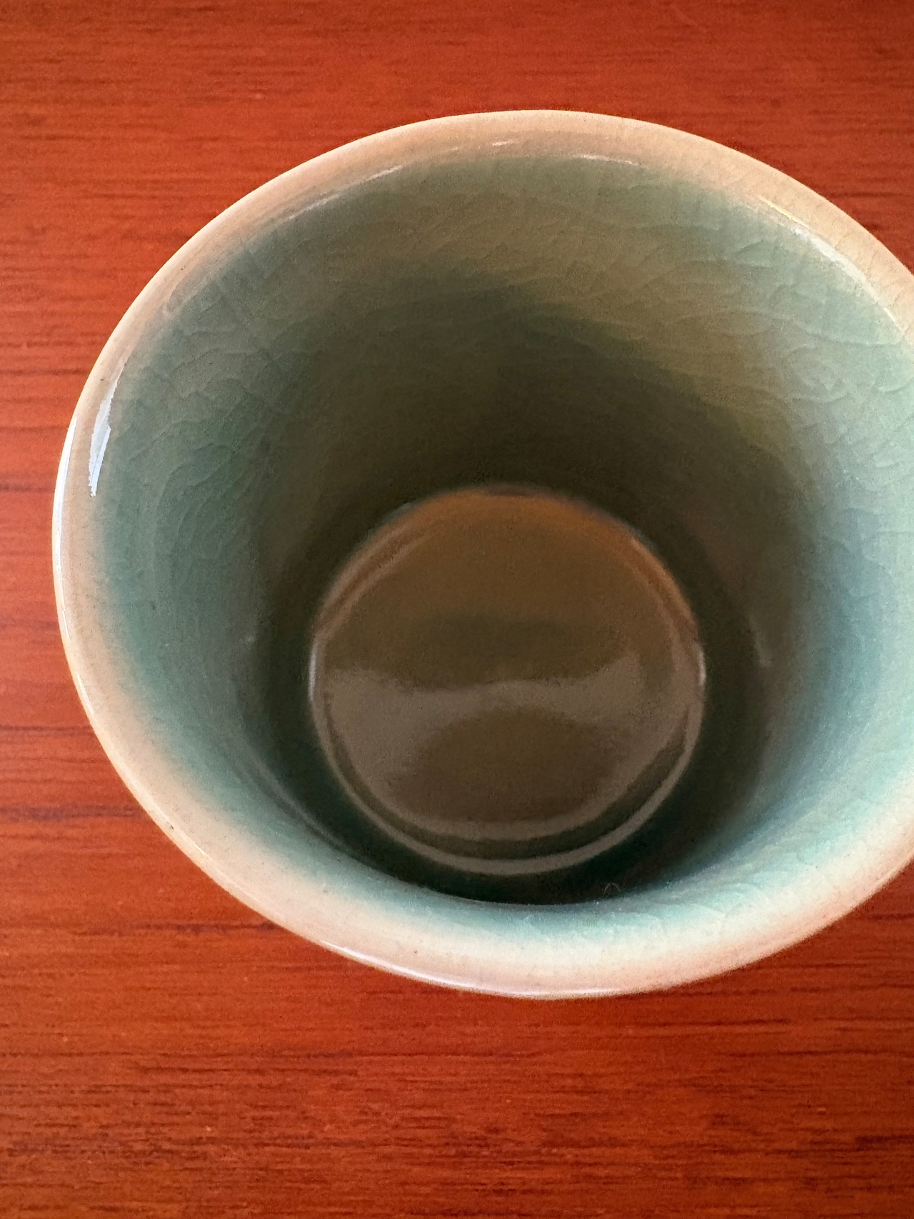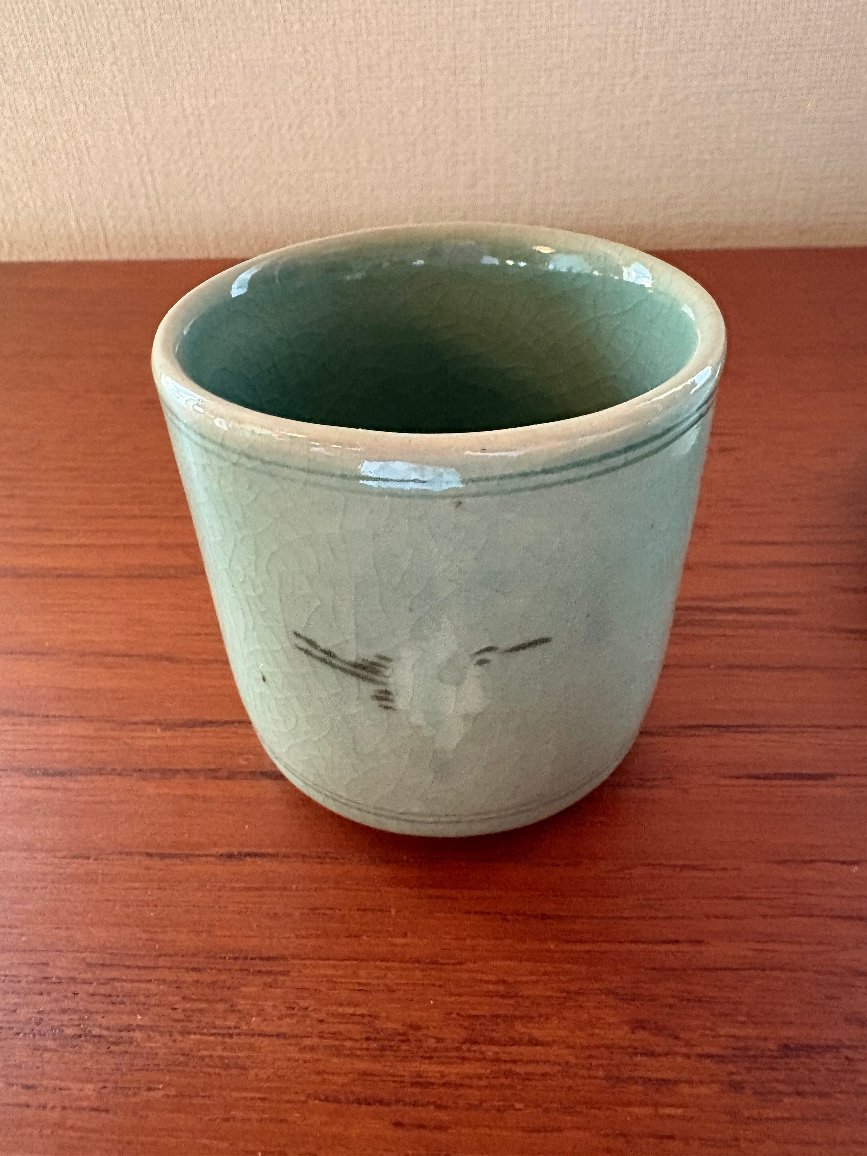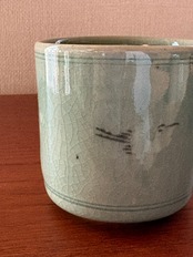 韓国のものでしょうか?裏に銘が入っています。鶴の模様の青磁の湯呑みです。