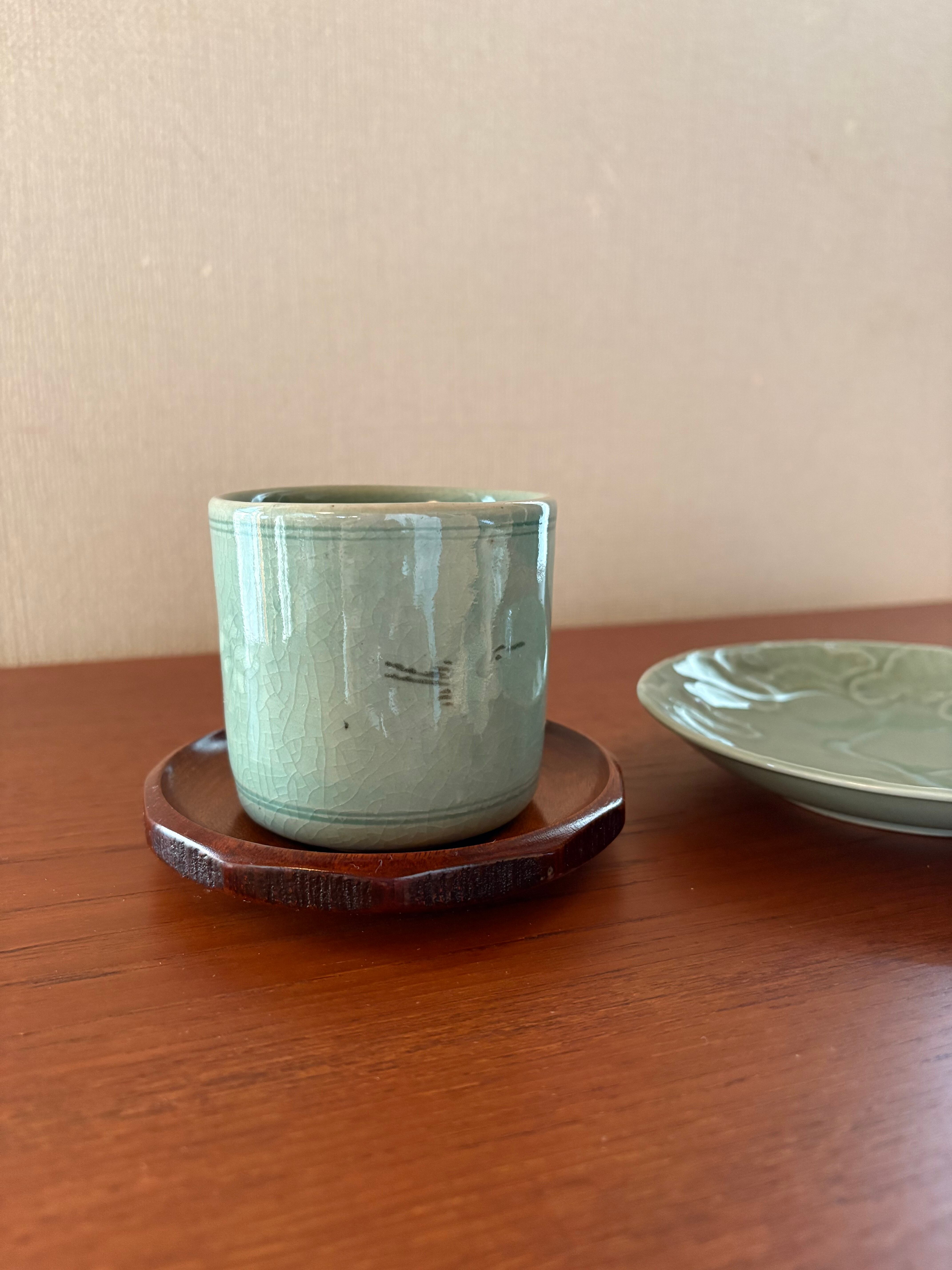 青磁の湯呑みとお皿、茶托のセットです。