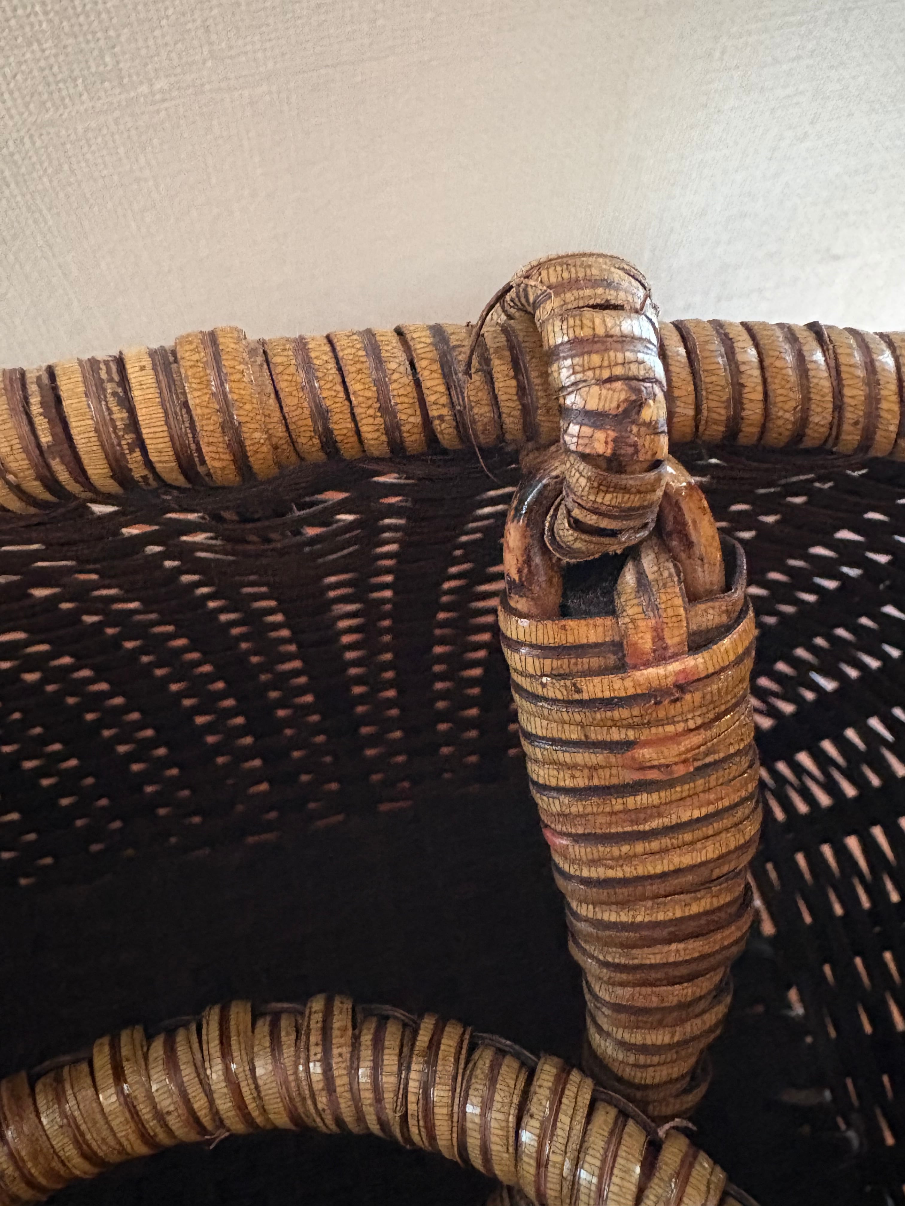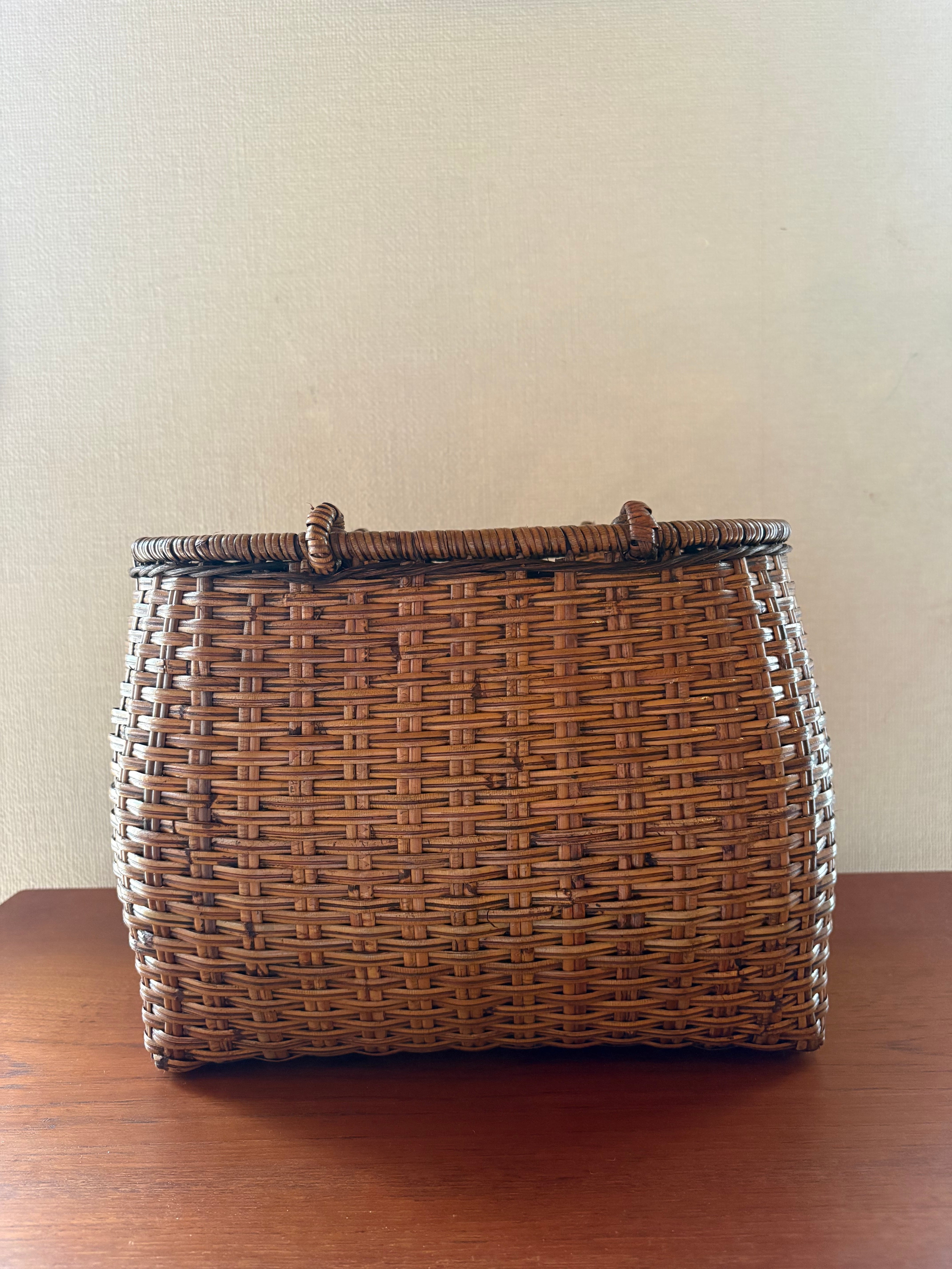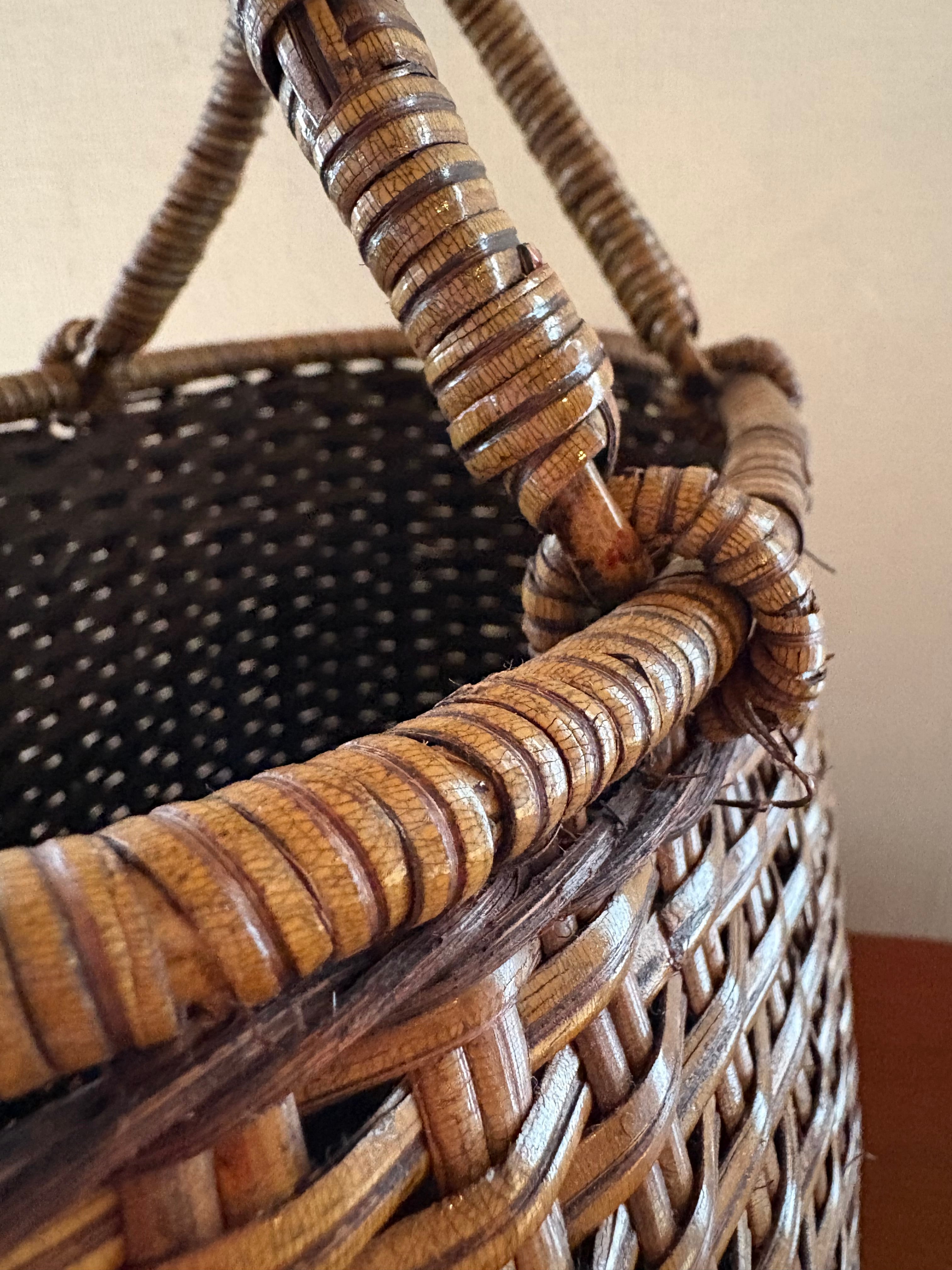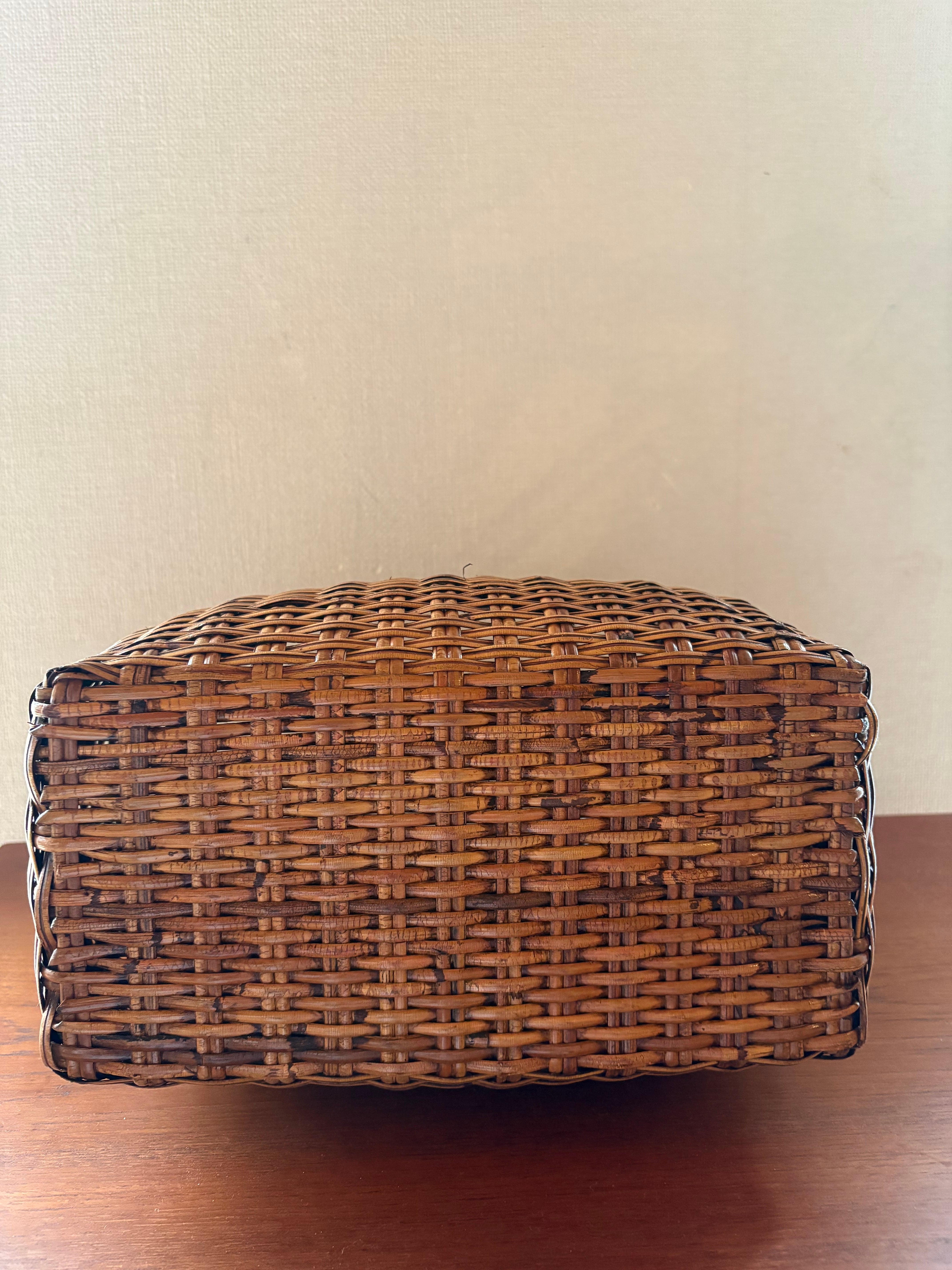経年による色の変化や籐の編みが少し解けた箇所(取手の部分、ボンドなどで修復可能です。)があります。ささくれなども若干ありますが